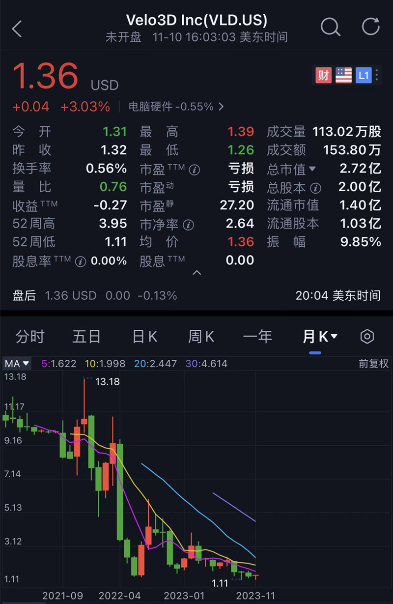 △2023年11月13日Velo3D股价