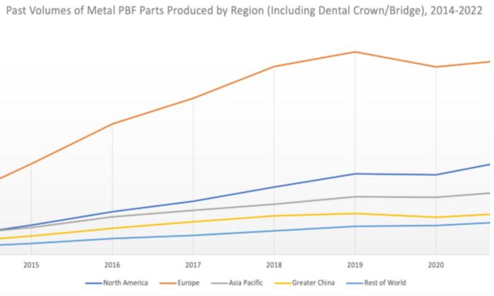 北美地区PBF工艺生产的零件数量从2014年的110万个跃升至2022年的近700万个;